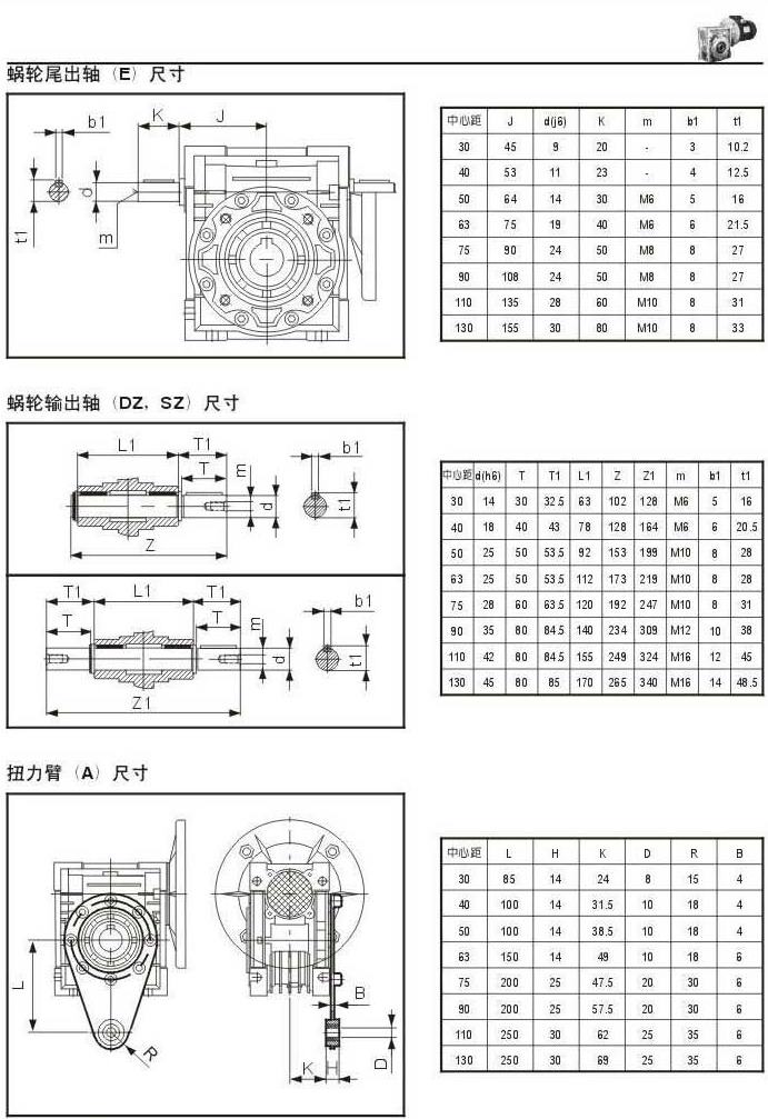 蝸輪尾出軸(E)尺寸蝸輪輸出軸(DZ,SZ)扭力臂(A)尺寸